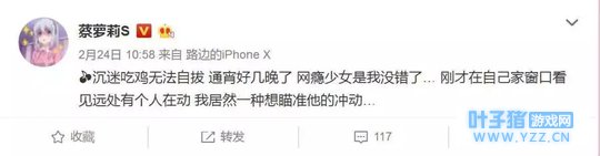 最近,全民直播的二次元萌妹主播蔡萝莉更新了自己微博,蔡萝莉早微博上称自己成为网瘾少女,看到人从窗户过都想瞄准。