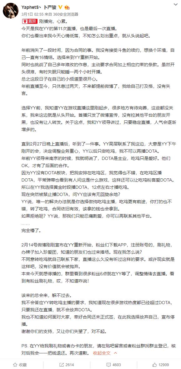 Pis在微博宣布,因为YY禁止他播DOTA2,让他播吃鸡。所以他决定停播YY。稍后Pis又公布了最新进展:YY撤回了之前的决定,改为Pis需增加吃鸡的时长;但由于无法信任的YY,Pis还是决定停播!离开YY!