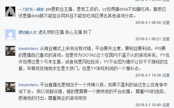 要知道YY和PIS之前是说好了的,PIS主要播DOTA然后才是吃鸡!面对YY的出尔反尔很多粉丝也都力挺PIS!还有DOTA2知名主播Zhou也支持PIS!