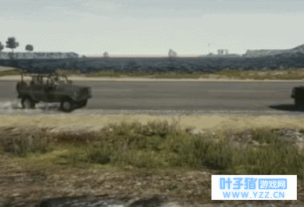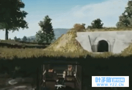 第三张游戏截图:开着吉普车的一队玩家,正准备把车停靠在防空洞旁边,前去防空洞搜索。然而,由于开着玩家的操作失误,一不小把车撞到了防空洞墙上,车子突然被引爆了,一队人就此结束了这场游戏。