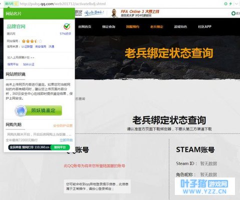 骗子盯上国服“吃鸡” 猎网平台专家支招防骗 对于此类案件,360安全专家分析称,不法分子利用目前火爆的《绝地求生》游戏的热点,专门制作出同国服官网一模一样的钓鱼网站,并利用搜索引擎获得靠前展示位置。一旦有用户误入该钓鱼网站,并按要求填写了个人信息,不法分子就可直接窃取到他们的QQ和Steam账户及密码,然后进行盗刷。 针对游戏类钓鱼网站诈骗案件,360安全专家给出了以下几点建议: 1.目前国服《绝地求生》预约官网只有一个,在申请预约资格时要注意所入网站是否正规、官方; 2.对于要求输入个人账户信息的网站,一定要仔细核实,还可以通过360浏览器的网站名片查看网站信息及安全性;