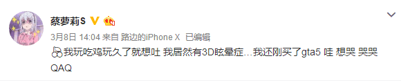 但是,蔡萝莉突如其来的一句话算是说的很扎心了。蔡萝莉表示:吃鸡玩久了,就会想吐!此言一出不少网友都是表示一脸懵逼,但是随后蔡萝莉也解释了一波。原来,世界上有一个叫做3D眩晕症这个东西的存在,很恐怖!而吃鸡,都懂的,玩的时候确实容易晕头转向啊!