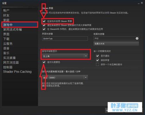在图中红框处可以打开steam的设置面板 1. 在游戏内显示帧率,和关闭shift+Tab的快捷键(方便跑步时可以开背包)