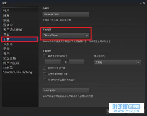 图中把“在游戏中启用steam界面”的勾取消掉就可以了,也可以自己设置一个不会发生冲突的键位。帧率的显示也可以根据自己的喜好显示在屏幕的四个角,另外建议勾选高对比度颜色,不然看不清楚显示的帧率。 2. 修改游戏下载区,有的时候遇到更新会卡住,重启steam能重新下一段又卡住的情况,可以尝试更改下载区来流畅下载。