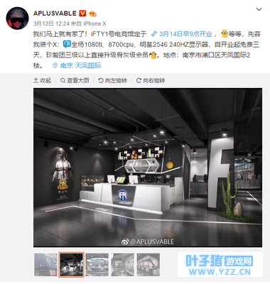 根据大哥A+在微博透露,iFTY的1号电竞馆即将于3月14日早9点开业。全场1080ti、8700cpu、明基2546 240HZ显示器,自开业起免费三天!!! 电竞馆地点: 南京市浦口区天凤国际2楼。在南京周边的朋友可千万不要错过捕捉大哥A+的机会!
