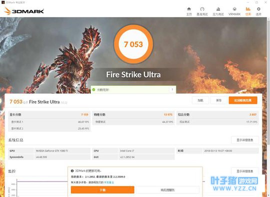 接下来再来看看3D MARK 2013的跑分,直接跑得Fire Strike Ultra,也就是在4K画质下的跑分,得分7053,较公版提升明显,当然其默认频率1569 MHz也是较公版的1480MHz提升不少。