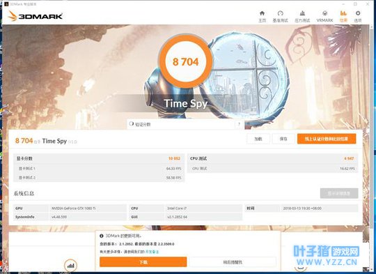 这个是DX12下的测试,随着win10系统用户越来越多,更多的游戏也是加入了DX12的怀抱,在Time Spy往往更能反应显卡的游戏性能,得分8704,非常的高,高得分也就也为这玩游戏可以有更高的帧数,运行起来更流畅,当然玩吃鸡也不例外。