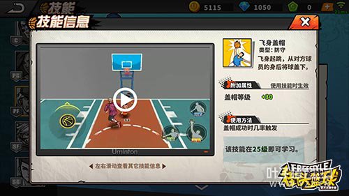 飞身起跳从对方球员的身后将球盖下,盖帽等级+30,盖帽成功时几率触发。 强力盖帽