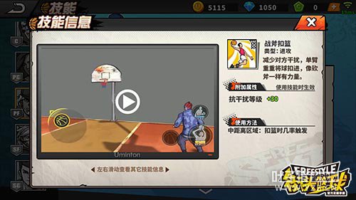 减少对方干扰单臂重重将球扣进,像砍斧一样有力量,抗干扰等级+30,中距离区域扣篮时几率触发。 选择战斧主要是因为,战斧扣篮解锁等级低,一上场就能使用,没有太高的操作难度,当然玩家们喜欢其他的扣篮技能,也可以替换掉。 飞身盖帽