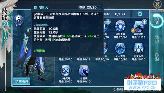 二、技能简介 1、剑飞惊天【主动技能】远距离攻击目标,目标及周围小范围内落下飞剑,造成伤害并有概率造成眩晕,施展距离10米。