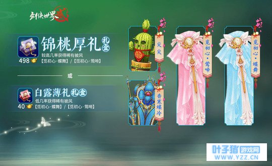 9月6日维护后-9月20日04:00,奇珍阁、赠礼商店同步限时上架披风礼盒【锦桃厚礼】,售价498元宝,上架【白露薄礼】礼盒,售价40元宝。