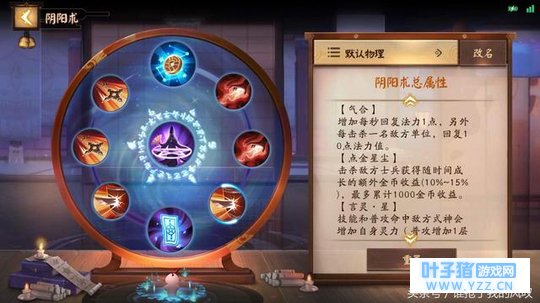阴阳术推荐 二攻速、二物穿、二吸血,主阴阳术选言灵·星增加伤害,其他两个选择点金星尘和气合,增加金币收入以及回蓝速度。 装备推荐
