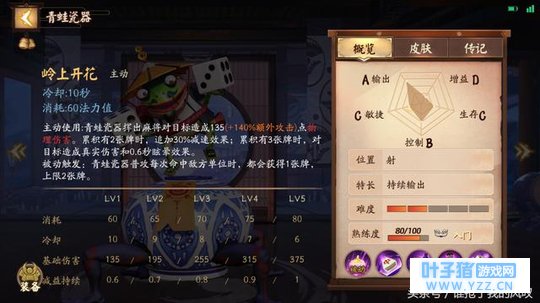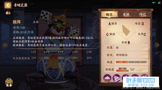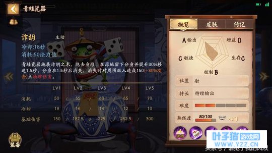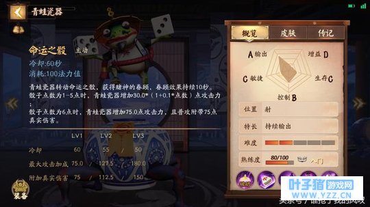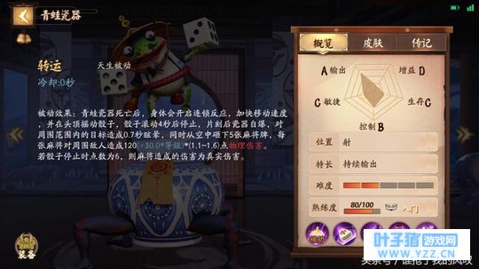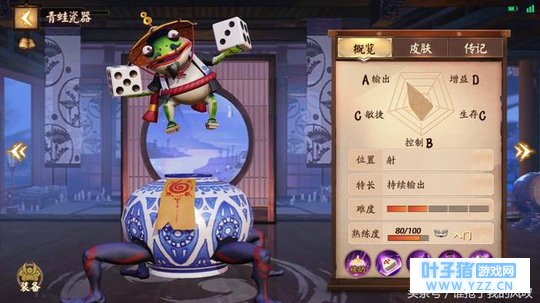 青蛙瓷器在游戏中担当射手位,输出能力一流,技能全面,唯一缺点没有位移技能,战斗的时候一定带瞬步,操作难度2星。
