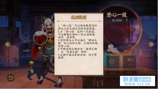 请输入图片描述 澄心值 当你与心爱的式神一起战斗之后,你与式神之间就会增加澄心值,澄心值是你与式神之间亲密度的证明,而澄心值到达一定程度后会解锁有趣的语音、表情、动作等,鉴于小编还没有解锁,这些就请大家多多发掘啦,解锁到有趣的彩蛋请务必告诉小编!