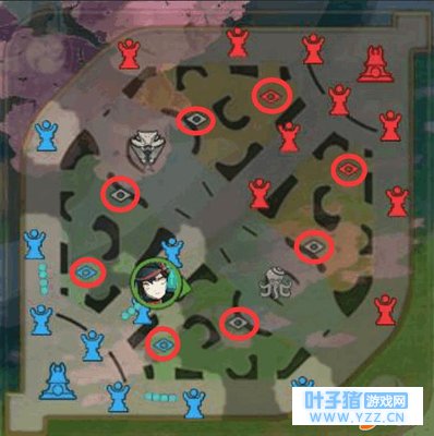 (二)而在己方高地前沿还有提供保护视野的灯笼,你将永远拥有这些保护性的视野。但要提防,如果有敌方式神入侵这块区域,他则能在短时间内与你共享这块视野。 这块灯笼的视野是一部分覆盖一部分草丛视野的,对面英雄可以共享这个视野,更轻易获得我们英雄的动向。 小技巧:反野时,我们可以再图示2个位置拉野反野,在反野的同时不暴露自己的位置。