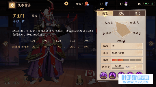 2、罗生门 被动触发:茨木童子周围存在罗生门领域,进入领域的敌方式神会受到压制,降低14%攻速。 点评:对线近战式神比较不错,怕远程法师消耗,能把近战按在地上摩擦,远程也不怕,咱们还有下一个技能。