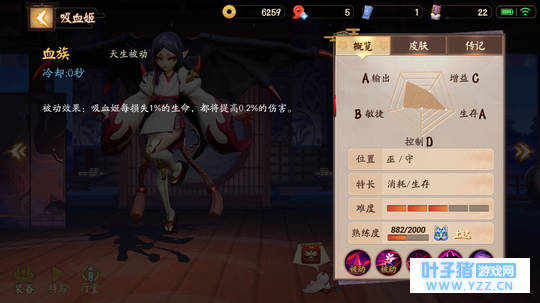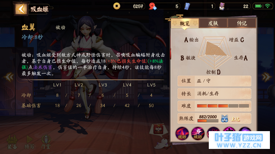 吸血姬的面板突出双A,A的输出和A的生存,输出,与生存并重的式神;但她没有控制,D的控制使她无法限制敌人的任何行动;拥有B的敏捷,不是很高,区区够用;对团队的增益却有C,我也不知道这个是怎么设定的…反正我觉得她是一个比较偏向个人主义的式神。定位:巫/守,是典型的法坦,特长:消耗/生存,难度有三格,其实吸血姬上手还是特别简单的!