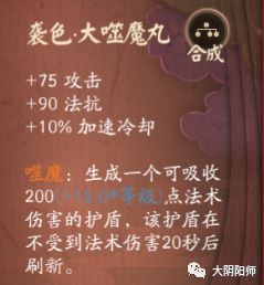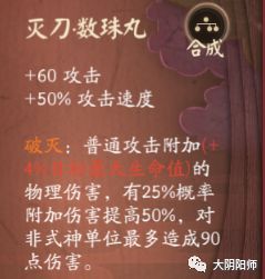 面板提供攻速最高的装备,攻击中规中矩。 被动效果: 每隔6秒让普攻携带一次法术伤害为50(+10*等级)的闪电链弹射五个敌人,每次普攻可以减少充能时间2秒。也就是相当于A三下左右就可以触发一次闪电链。 适用于除了白狼之外的大部分射手类式神,也适用于需要攻速的物理输出式神。 2.天照·丛云剑(总价格2000) 全面的面板,大部分物理输出需要的属性都有,并且数值都不低。 被动效果: 普攻回蓝,且每次使用完技能后的下次攻击会额外造成理论值最高为270的物理伤害。属于攻击特效。 适用式神:妖狐。其他角色不推荐出。 3.袭色·大噬魔王(总价格2100)