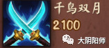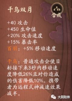 面板与分裂弓无差别。 被动效果:在你对敌方式神造成物理伤害的时候可以降低对方的吸血效果、生命恢复、治疗效果50%。是一件克制回血快or吸血高的英雄专用的装备。 可克制式神: 惠比寿、鬼使黑、姑获鸟、孟婆、犬神、吸血姬、狸猫、海坊主、清姬、茨木童子、夜叉。 5. 千鸟双月(总价格2100)
