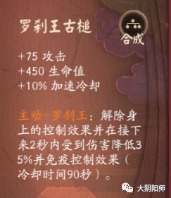 中规中矩的攻击,物理系输出装备中仅有的针对法术伤害的防御装备。 被动效果还附带一个不低的抵挡法伤的盾。 适合在对面有大量的法术伤害角色的时候出,正常情况下属于冷板凳装备。 4. 罗刹王古槌(总价格2100)