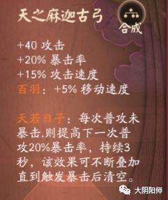 面板提供可观的攻击力和暴击率。 被动效果:简单点理解就是提升式神的暴击伤害50%并且在暴击的时候额外附带40点物理伤害。 适用式神:大部分平A型物理输出,常用于射手。 2. 天之麻迦古弓(总价格1900)