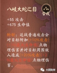 较高的攻击面板,不错的生命值提升以及小幅度的冷缩。 主动效果 可以瞬间解除控制效果,并且2秒内免疫控制效果且所受伤害降低35%。 对面控多的时候,出此装备。 5. 八岐大蛇之目(2300)