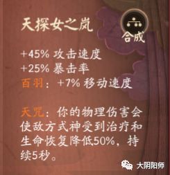 高额的攻速以及暴击率。 被动效果:让远程英雄的普攻附带分裂效果,最多同时攻击3个单位。但同时攻击三个单位的情况下,普攻基础伤害降低45%。 分裂效果仅限远程英雄有效。且不继承绝大部分攻击特效,例如:妖狐的弹弹乐,白狼的百分比伤害技能主动。 但继承鸠的两个被动,简直暴爽!哪怕对面一群前排,只要有人保护你前排也是纸! 4. 天探女之岚(总价格1750)