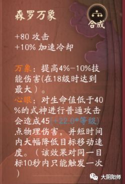 面板属于较高的攻击水平,以及小幅度的冷却缩减。 【万象】: 提高4%-10%技能伤害(所有伤害类型),在18级的时候达到最大的效果。非常适合于偏向于技能输出的物理式神。 【心眼】: 对生命值低于40%的式神进行普攻会附带你等级相关的物理伤害,最大理论值为441的物理伤害并且大幅度降低目标移动速度(目测超过50%的减速效果)。(十秒内对同个目标只能触发一次) 适合给后手入场的收割型物理式神使用。 2. 极心无梦(总价格1950) 面板同森罗万象。 被动效果: 【无梦】:效果同【万象】,但可以和【万象】叠加。 【极心】:每秒提高3点移速,最大提高30点。达到30点后的下一次普攻消耗所带来的移速并造成额外物理伤害,最高理论值为190,由近战类式神携带还能提供50%的减速效果。 移速加成受到普攻或控制效果会衰退。 适用于对移动速度需求的物理输出角色使用。 1. 高天雷震(电刀)(总价格2250)