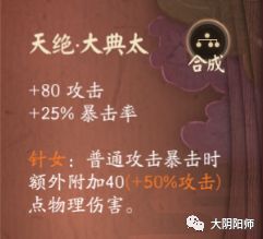攻防兼备的面板。(远程式神基本上都是满级裸装160左右护甲,90甲可以说加了将近一半还有多的甲) 被动效果:根据损失的血量提供物理吸血和攻击吸血,在血量处于20%以下的时候达到最大值,算上面板总共可以获得26%的攻击吸血、16%的物理吸血。 是一件给依赖于技能伤害的物理式神使用的装备,能让脆皮鸡式神们不用再担心被打野位跳到脸上为所欲为。 适用式神:鸠、管狐、妖狐、以津真天、万年竹等。 暴击类装备 什么是暴击?暴击=普通攻击有几率打出双倍的物理伤害。 暴击率:影响普通攻击暴击的概率,上限为100%。 暴击伤害:正常式神默认的暴击伤害为200%,这个伤害可以通过装备以及阴阳术来提升。也有的式神初始暴击伤害只有150%,例如九尾猫。 1. 天绝·大典太(总价格2300)