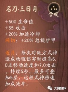拥有攻击攻速生命值以及暴击率,面板均衡,适合平A系刺客转半肉。 被动效果: 降低被你A过的人三秒内对你所造成的伤害。适合大后期刺客切输出位时携带。 远程英雄不推荐携带此装备。 适用式神:妖刀姬、夜叉。 P.S.游戏中装备被动同名的话被动效果不叠加,如果数值有差异则取其中最大值。 上述暴击类装备中所附带的被动【百羽】均为同名被动,多个同名被动同时存在不叠加,只取其中最大值。 护穿类装备 护甲穿透or忽视护甲:无视对方一定数值的护甲。 1. 名刀·三日月(总价格2000)
