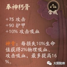 系统推荐装备中常见的物理输出吸血装备。 加100的物攻,是所有物攻装备中所提供攻击面板最高的一件武器,以及20%的攻击吸血。 被动效果:在你造成一次击杀或助攻的时候可以瞬间回复自己10%的基础生命值。 P.S.基础生命值: 除去式神被动技能,装备加成以及阴阳术加成后所剩下来的式神本身的生命值。 2. 奉神朽骨(总价格2100)