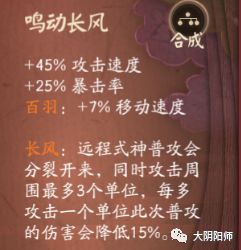 暴击弓, 看似面板属性在所有暴击类武器都较为低,然而其被动【天若日子】的存在,使其的效用有个较大幅度的提升。总体来说,在你只有这把装备的情况下,你能做到每四下之内必定暴击一次。 适用式神:爆发性普攻刺客。 3. 鸣动长风(总价格1750)