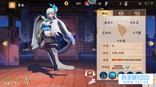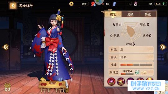 2、鬼女红叶 红叶也是有2个被动,一个是生命值在30%以下时会有一定的增益效果,另一个是技能命中敌方会在其身上增加一个娃娃,之后娃娃爆裂会造成伤害。一技能放出枫叶信笺在多个目标流动并造成伤害(有点类似于甄姬的二技能),并且枫叶信笺飞回来会给自己加一个护盾。二技能是个控制技能,枫叶爆裂2次,造成眩晕或者减速效果。虽然红叶手短,但她的大招是全图的,会一次对敌方每个式神造成伤害。