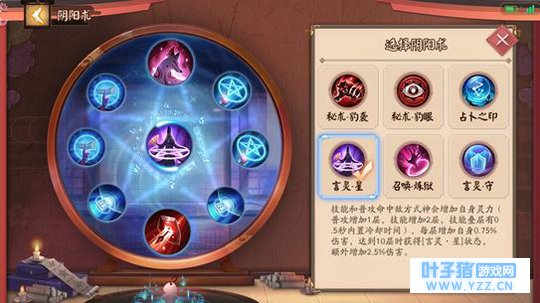 阴阳术选择 由于跳跳妹妹多在中路对线,中路多为巫类式神,因此需要带法抗来缓解前期对线疲软期的压力,雀羽之印的加成略少因此选择狐火明焰来提高生存能力,因为跳跳妹妹的输出方式属于使用技能穿插被动持续打出伤害,因此言灵·星更契合跳跳妹妹。