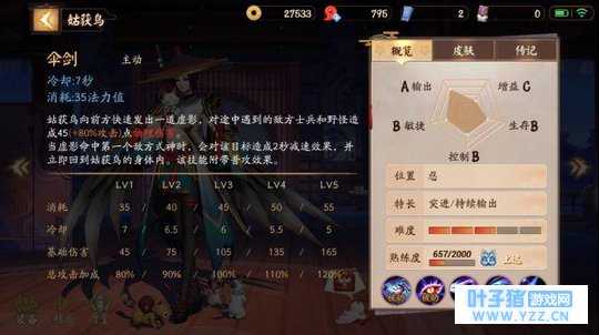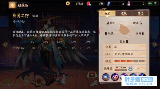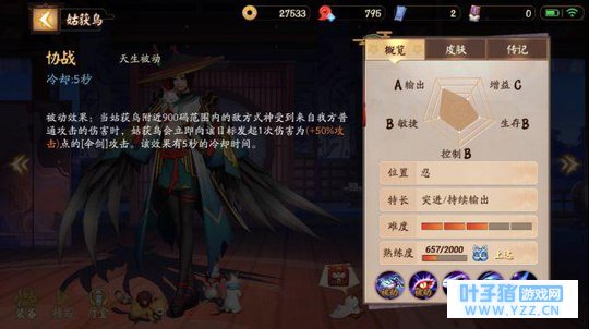 通过这两张数据图,我们可以看到,姑获鸟本身定位的数据比较平均 在初始数据中,我类比了其他忍系式神(妖刀姬、骨女、夜叉等),发现所有忍系式神在初始数据上其实半斤八两,并没有哪个忍系式神在初始阶段更有优势(图中初始移动速度是在晴明井的状态,所以数值应该是360) 而对于姑获鸟而言,她的优势在于进攻时能有效地减速敌方、自身可以快速突进或是逃跑,大招能造成范围性伤害以及短暂的控制 当然,姑获鸟的劣势也是存在的:自身血量相对较少、没有强控技能、大招释放时间不好的话,敌人可以安心从你的大招范围里若无其事地走出去 二. 技能解析 天生被动:协战