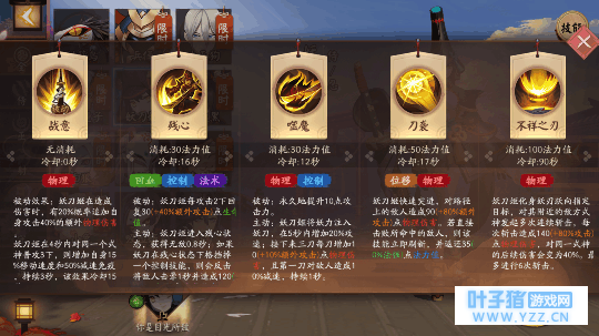 为什么相同的式神在不同的大人手里展现的攻击力不同,就是因为对英雄的理解不同。 下面我们看技能。被动技能是很好的追杀的神技,上单对线中用噬魔—刀袭—残心来打消耗:噬魔5秒内增加攻击力,刀袭近身一下平A,之后开残心抵挡敌人技能基本可以做到无伤消耗。 大人们在消耗过程需要注意自己蓝量消耗。消耗几波,敌人血量到4分之1就可以连一套刀袭—平A—噬魔—平A—残心—平A—不祥之刃来解决掉敌人。用噬魔可以取消平A的后摇,手速快1秒内可以打出2到3下平A,打出被动敌人自然是大人们囊中之物。