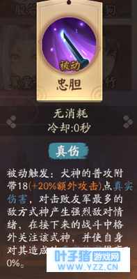 【忠胆】使犬神的输出进一步得到提升,每一下普攻都能附带额外的真实伤害,随着技能等级和自身的攻击力提高,真实伤害也会提高。对敌方最近击杀数量多的式神会产生一个buff,攻击此目标还会加重对其造成的真实伤害(目标头上会有一个狗头标记)。【心剑】的范围性普攻能够触发【忠胆】的真实伤害。