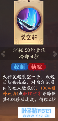 【裂空斩】是犬神常用的输出、消耗手段,低耗能、冷却时间短,附带减速击中目标后可以很好的发挥【心剑】被动快速砍出三刀,此时能量以恢复30点(忽略自然恢复)。且技能的物理加成极高,技能动作快,附带一小段位移,伤害和控制效果是范围性。