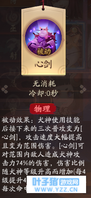 【心剑】是犬神的核心被动技能,自身等级越高被动效果越强。使用技能后在约5秒内的前三次普攻造成能够范围伤害并且攻击速度大幅度提升(高达约2.3),每一下普攻都能恢复自身能量和生命值。若5秒内没有完全打出前三下普攻,或者时间过了,强化普攻和攻速加成则失效,若在5秒内打出三下普攻,被动攻速加成亦会消失。被普攻的主体会受到正常暴击影响和装备特效等,受范围伤害影响的单位则不受暴击效果,但能触发装备的被动效果。注:在【心剑】触发的状态下,犬神的剑和手会泛有蓝光。
