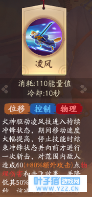 [ 前期1级] 【凌风】能对前方范围的所有单位造成伤害(伤害加成高),并且能击飞目标,在击飞的同时犬神会向前方突进,目标还会被强制移动一段距离,方向与犬神施展【凌风】的方向一致,落地后还将陷入减速状态,最高可达90%减速。