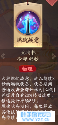 【燃魂战意】能够瞬间加强犬神的各方面的能力,开启后8秒内的普攻全部升格为【心剑】的范围性普攻,攻速大幅度提升,移动速度最高提升40%,每次使用技能可延长状态1.5秒(不论技能是否命中)。此技多用于偷塔和团战切入时开启,在现有的时间内打出最高的伤害。