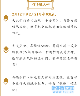 春和挚友协同赛 2月12日至2月2 1日每晚2 0:00-23:00 , 大大们以 五人组队的形式 在游戏内进行 “为崽而战” 参与。 无需报名,所有阴阳师大人们都可以携挚友参赛,总奖励额超过了 100万人民币 ! 具体奖品有 现金红包 、包括妖刀姬手办在内的千件 正版周边 、以及海量 游戏道具 ! 更有偶遇 红人&大神 战队的别致玩法,阴阳师大人们将可以一睹红人&大神战队风采。 ▲单人/三人组队参与的为崽而战或单人/三人/五人组队参与非“为崽而战”的对战皆无法参赛,赛事具体信息,大大们可以挪步官网了解。