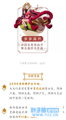 2月2日更新后-2月9日 5:00 每天完成的前两场比赛,可额外获得 「华裳之礼」 (包括资质赛、为崽而战、百鬼弈和协同试炼),每天最多获得两份。 开箱从「华裳之礼」中可能获得数量不等的金币、 皮肤券、式神召唤符或者祈福纸签。同时,两次开箱必得一张 皮肤折扣券 。 皮肤折扣券使用时段: 2月9日更新后-2月16日 5:00 所有皮肤折扣券的折扣将进行叠加,并可以用于购买 任意一套皮肤 ;如果购买的皮肤拥有其他折扣,则可以获得 折上折 的优惠。 新春御祝 2月16日~2月22日 每日都会有不同的式神向阴阳师大人们送来新春御祝, 大大们 每日首次分享 御祝即可获得神秘奖励。 <步步高升>