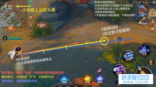 决战平安京姑荻鸟一技能:使用技能后就会被动触发吸血效果,最多能触发8%,由于一技能的存在,姑荻鸟不用出吸血装,在出装上会比其它打野式神更暴躁。对于技能中所说的视野扩大的概念,很多小伙伴表示看不懂,那小编就用一张图片为大家详细解释一下。