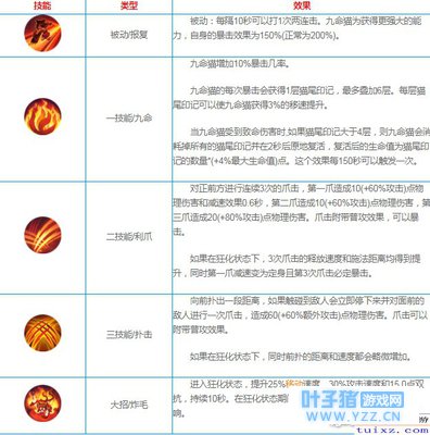 基础资料: 名称:九命猫定位:忍 售价:1888金币/18召唤券特长:持续输出/突进 难度:☆☆☆式神大全:点击此处 使用技巧:暴击会为九命猫带来额外的收益,且九命猫具有极高的持续输出能力,利用好开启大招后的高移速追逐四散逃跑的敌人。 技能介绍: