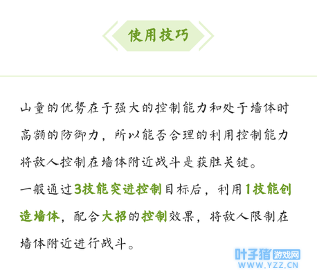 天生被动[山之护] 被动效果:山童处于墙体附近280码以内会 持续提升 山童的 护甲和法术抗性 。