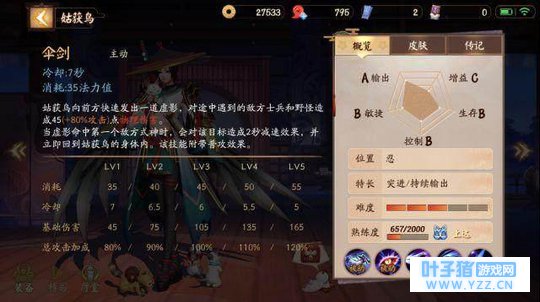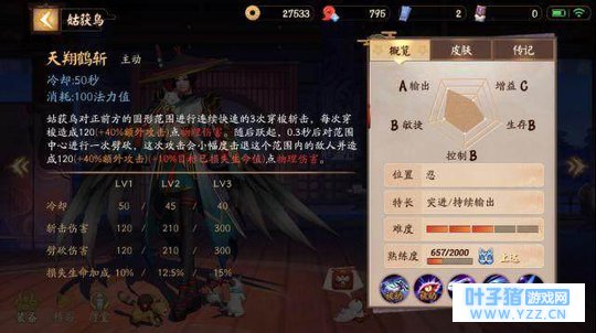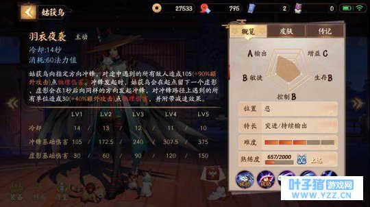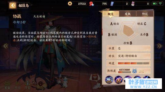 通过这两个数据图,我们可以看到鸟类自身位置的数据与平均值相比较。 在初始数据,其他部门可以类比式神(姚道继,女,犬夜叉,骨等)发现,所有的线可以在初始数据和没有人一样的式神,在初始阶段的式神优势部门(图移动速度在初始状态,所以价值应该很清楚360) 而对于姑获鸟而言,她的优势在于进攻时能有效地减速敌方、自身可以快速突进或是逃跑,大招能造成范围性伤害以及短暂的控制 当然,无论鸟的劣势还是存在的:自己的血比较小,控制能力不强,最终释放时间不好,敌人可以轻松自如地将你移到射程内。 两。技术分析 先天被动:协同