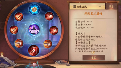 阴阳术搭配—暴击流 中部 言灵·星 :增加输出能力 上部点 金星尘 :增加装备成型速度 下部 破灭 :增加收割能力 左上部 暴击或者暴击伤害 :增加输出能力 右上部 吸血 :增加续航生存能力 下侧位 物穿 :增加输出能力