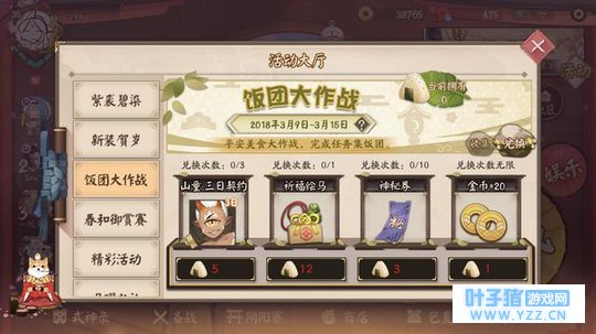 活动:每天完成指定任务收集饭团,饭团可兑换山童三日契约、金币等奖励。