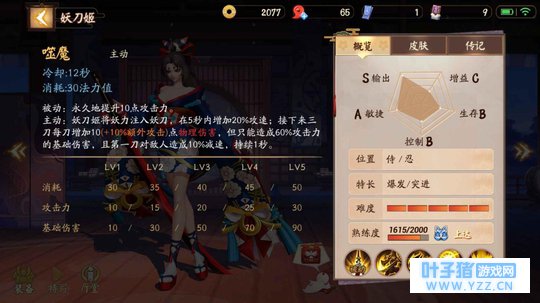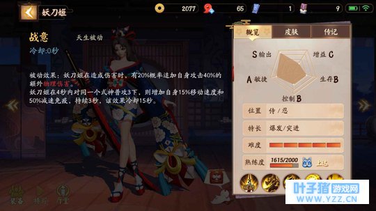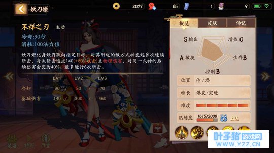妖刀这个式神大家一定都知道的。没玩过的也见过。没见过的也听说过。作为和荒输出能力并驾齐驱的s级别输出式神。那么妖刀姬到底有多厉害呢。废话不多说。接下来就详细的给大家来讲解一下妖刀姬这个式神。 技能详解: 战意:首先是这个被动技能,注意,这个被动是一个天生被动。也就是在游戏里是不需要加点也不能提升等级的一个技能。虽然这是一个被动技能。但是无论是伤害追加或者减速减免都是非常厉害的属性毕竟作为一个DPS。输出效率是很重要的。输出效率等于单位时间造成的伤害量。伤害追加提供了伤害。而减速减免和移动速度则提供了更好的输出空间。